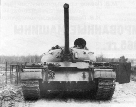 | Танк Т-54 с различными вариантами экранной защиты бортов. Секции экранов установлены в боевом положении (вид спереди). | Первый вариант экранной защиты танка Т-55. |